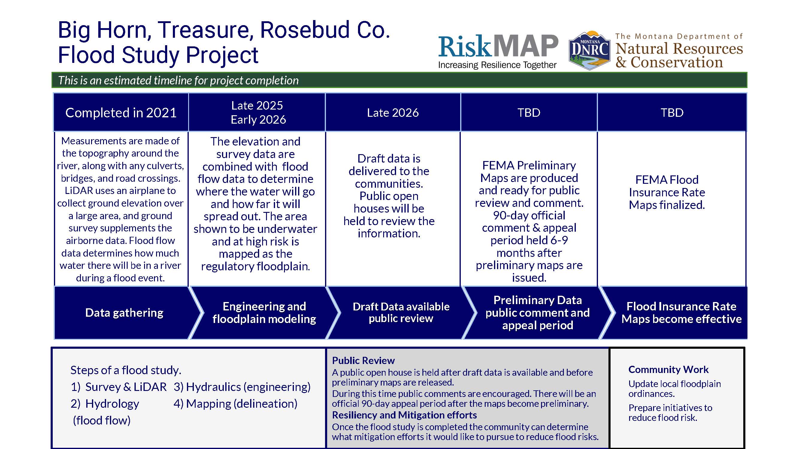 Big Horn, Treasure, and Rosebud Counties have been working with the Federal Emergency Management Agency (FEMA) and Montana Department of Natural Resources and Conservation (DNRC) to produce new and updated 1% annual chance (100-year) floodplain maps. The project includes updating all the existing mapped floodplains, and producing new maps for portions of Rosebud County.